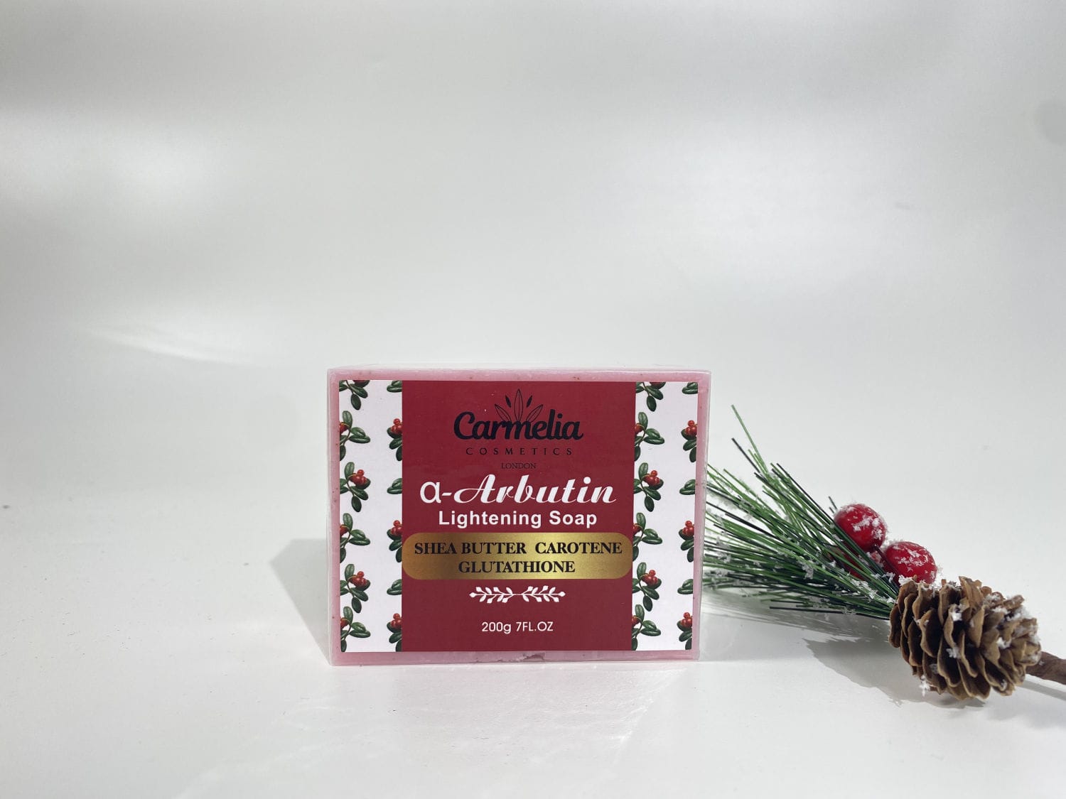 Carmelia Cosmetics Arbutin Lightening Soap is a formulated bar soap designed to cleanse and potentially lighten the skin. It contains a combination of ingredients intended to brighten the complexion while offering moisturizing and antioxidant benefits.