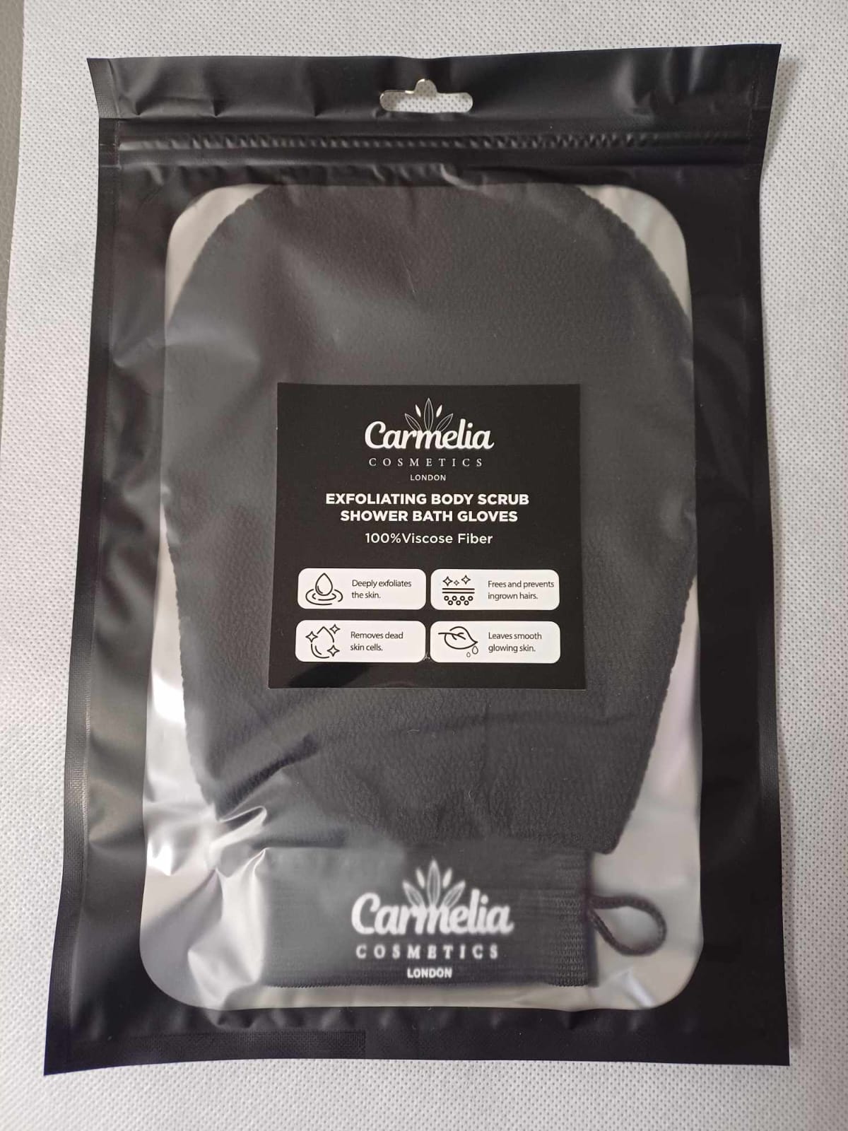 Carmelia Cosmetics Exfoliating Body Scrub Shower Bath Gloves are a pair of gloves designed to cleanse and exfoliate the body during showering or bathing. They are intended for use with your preferred shower gel or body wash.